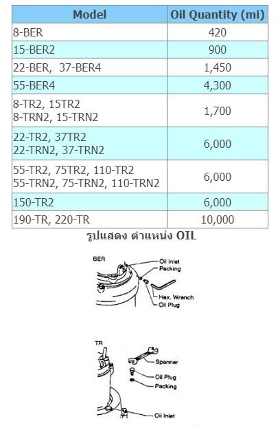 4.1 ตรวจสอบระบบหล่อลื่นน้ำมัน ตรวจสภาพทุกๆ 6 เดือน และเปลี่ยนทุกๆ 1 ปี ถอด Oil Plugของเครื่องเติมอากาศ เทน้ำมันออก ถ้าพบว่ามีน้ำผสมอยู่ในน้ำมัน (สังเกตได้โดยน้ำมันจะมีสภาพผิดปกติ) ซีลของเพลามีความจำเป็นต้องเปลี่ยน ถ้าน้ำมันที่เทออกมาแล้วอยู่ในสภาพปกติ ให้เติมน้ำมันใหม่ในปริมาณที่กำหนดไว้ แล้วทำการอุดด้วย Oil Plug