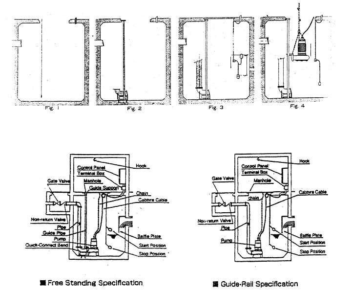 ภายในบ่อสูบได้ตาม Guide Pipe เข้าเชื่อมติดกับอุปกรณ์ส่งน้ำทางออก (Duck Foot Bend) เป็นอุปกรณ์ช่วยให้สะดวกในการตรวจซ่อมบำรุงเครื่องสูบน้ำเสียแบบจุ่มใต้น้ำโดยไม่ต้องลงไปในบ่อสูบ ทั้งชุดจะเรียกว่าชุด Guide Rail หรือชุด TOS ; TO