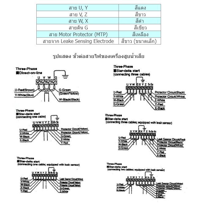 4.1 การต่อขั้วสายไฟ ตามตารางด้านล่าง สายไฟจากตัวเครื่องสูบน้ำเสียจะเป็นดังนี้