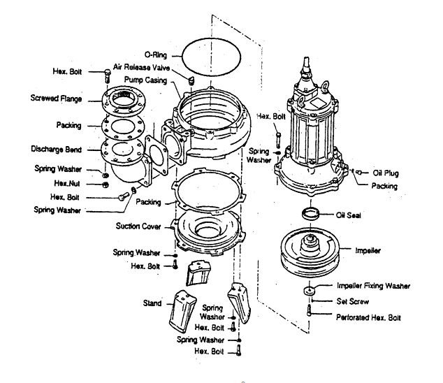 5.2 ถ้าสมรรถนะของตัวเครื่องสูบน้ำเสียลดลง อาจจะเป็นเพราะว่าใบพัดของตัวเครื่องสูบน้ำเสียสึกกร่อน หรือมีขยะอุดตันที่ใบพัด ถ้าเป็นเช่นนี้ให้ถอดใบพัดและเอาขยะที่อุดตันออก