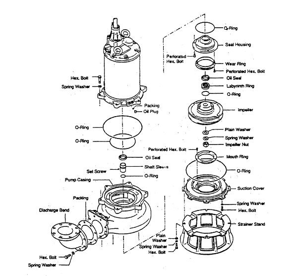 ของเครื่องสูบน้ำเสีย เทน้ำมันออก ถ้าพบว่ามีน้ำผสมอยู่ในน้ำมัน (สังเกตได้โดยน้ำมันจะมีสภาพผิดปกติ) ซีลของเพลามีความจำเป็นต้องเปลี่ยน ถ้าน้ำมันที่เทออกมาแล้วอยู่ในสภาพปกติ ให้เติมน้ำมันใหม่ในปริมาณที่กำหนดไว้ แล้วทำการอุดด้วย Oil Plug (น้ำมันที่ใช้ Turbine Oil ISO VG 32) ให้เปลี่ยนซีลยาง (O-Ring) ของ Oil Plug ด้วยถ้าพบว่าชำรุด